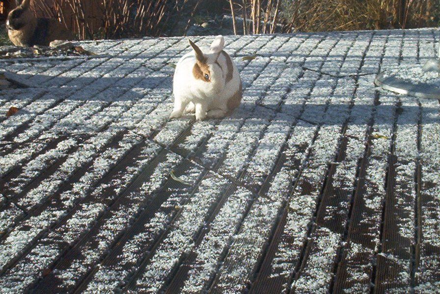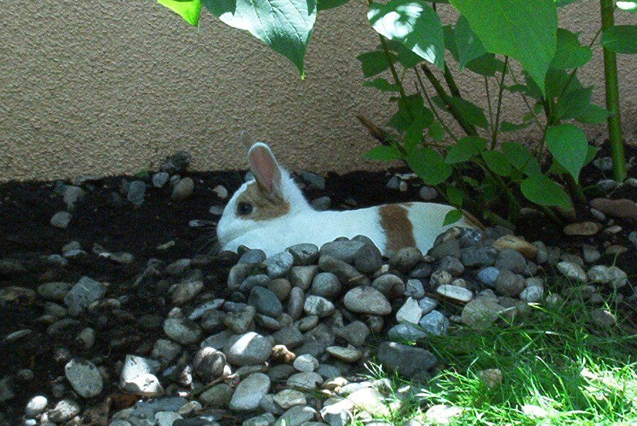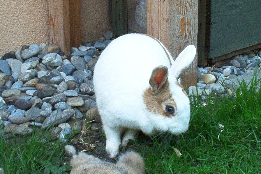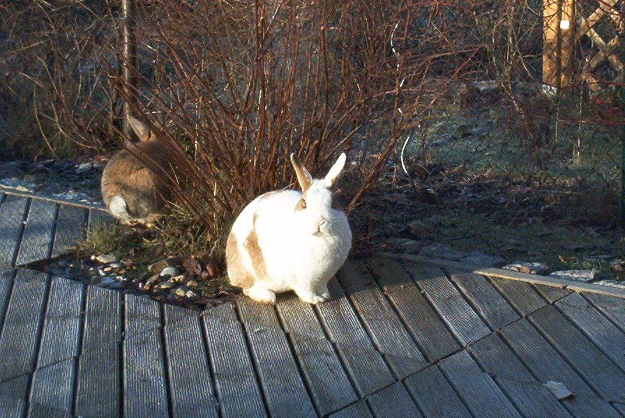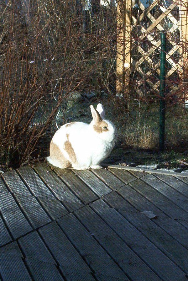 2001 zogen zwei süße junge Zwergkaninchen, Gulla und Jonas, bei der Menschenfrau ein. Nach einem Umzug und nach dem Tod der beiden letzten Kaninchen Felix und Noriah aus der Reihe, die 1973 ihren Anfang nahm, sollte es nun weitergehen. Die Kinder sollten mit Kaninchen aufwachsen, aber es sollte eine bessere, eine artgerechte, eine gute Haltung sein, nicht vergleichbar mit 1973. Viel dazu gelernt, noch lange nicht perfekt, ging die Menschenfrau daran, Vorbereitungen für die Ankunft der Kaninchen zu treffen. Ein erhöht stehender Kaninchenstall mit Leiter ins Tagesgehege. Noch war käfigfreie Haltung nicht der Standard, wohl aber guter Wille vorhanden und freier Auslauf in einem abgegrenzten Teil des Gartens während der hellen Stunden eines jeden Tages, manchmal auch überwachter Auslauf im ganzen Garten. Gulla eine hellbraun-weiß gezeichnete wunderhübsche Häsin mit blauen Augen und Jonas, ein hellbraun-braun-schwarz melierter Rammler, gerade ihrer Mama entwöhnt, fühlten sich trotz der Einschränkung nachts ansonsten sehr wohl in ihrem neuen Zuhause.